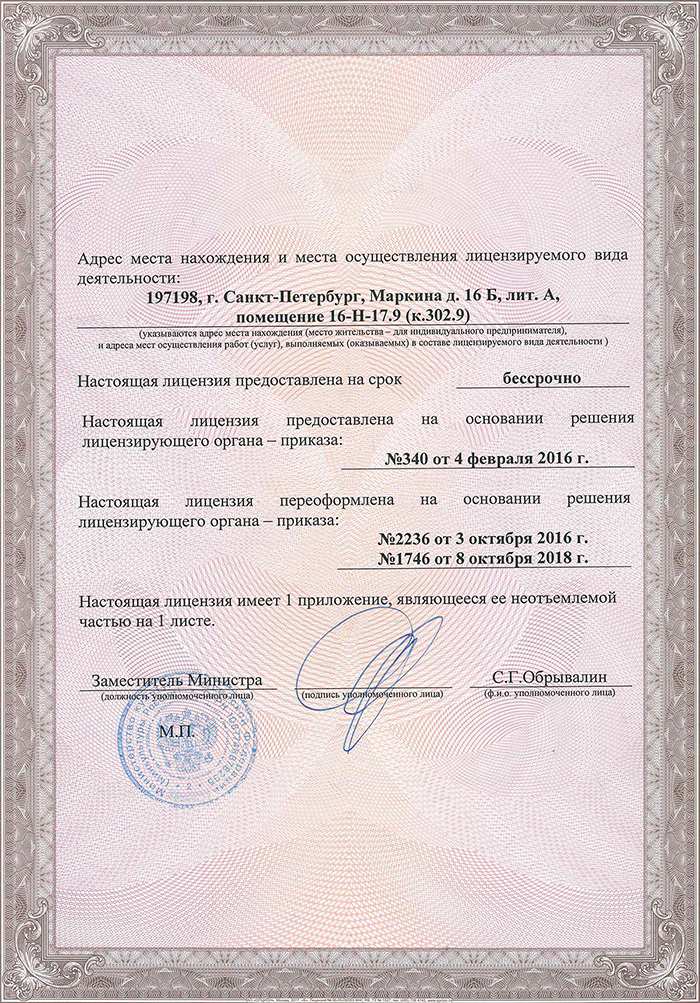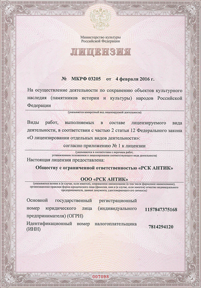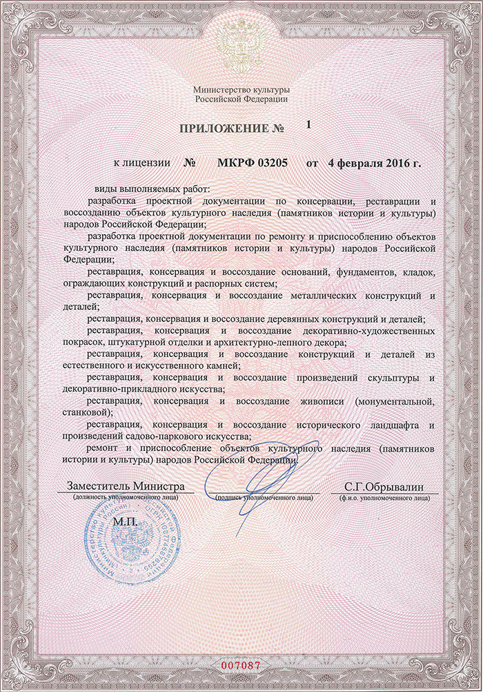 Лицензия М9 МКРФ 03205 от 4 февраля 2016 г. на осуществление деятельности по сохранению объектов культурного наследия (памятников истории и культуры) народов Российской Федерации